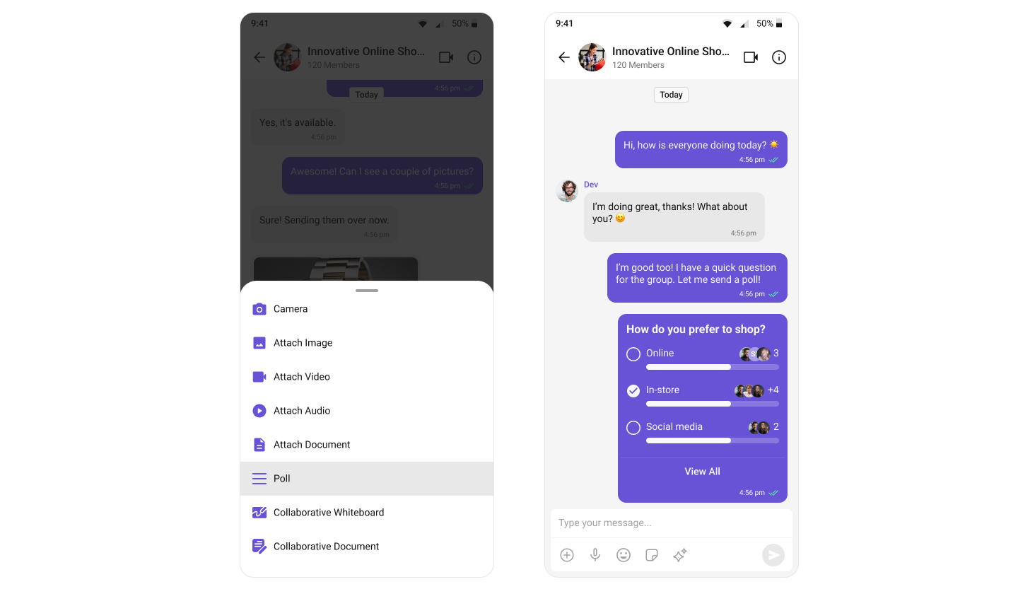 The Polls extension enhances group discussions by allowing users to create polls. Users can ask questions with a predefined list of answers, enabling a quick, organized way to gather group opinions. For a comprehensive understanding and guide on implementing and using the Polls Extension, refer to our specific guide on the Polls Extension. Once you have successfully activated the Polls Extension from your CometChat Dashboard, the feature will automatically be incorporated into the Action Sheet of the Message Composer component of UI Kits.