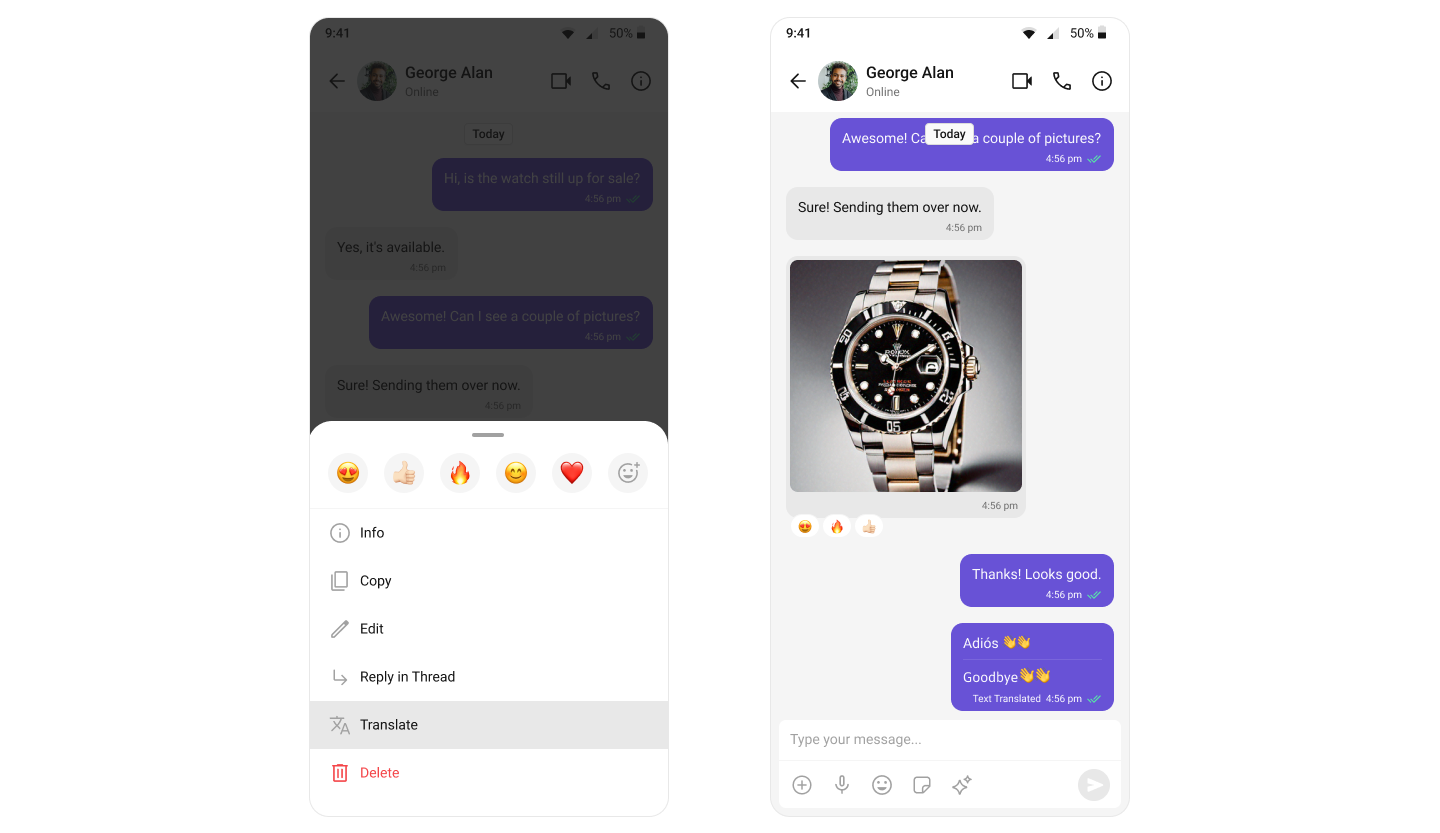 The Message Translation extension in CometChat is designed to translate any message into your local locale. It eliminates language barriers, making the chat more inclusive. For a comprehensive understanding and guide on implementing and using the Message Translation Extension, refer to our specific guide on the Message Translation Extension. Once you have successfully activated the Message Translation Extension from your CometChat Dashboard, the feature will automatically be incorporated into the Action Sheet of MessageList Component component of UI Kits.