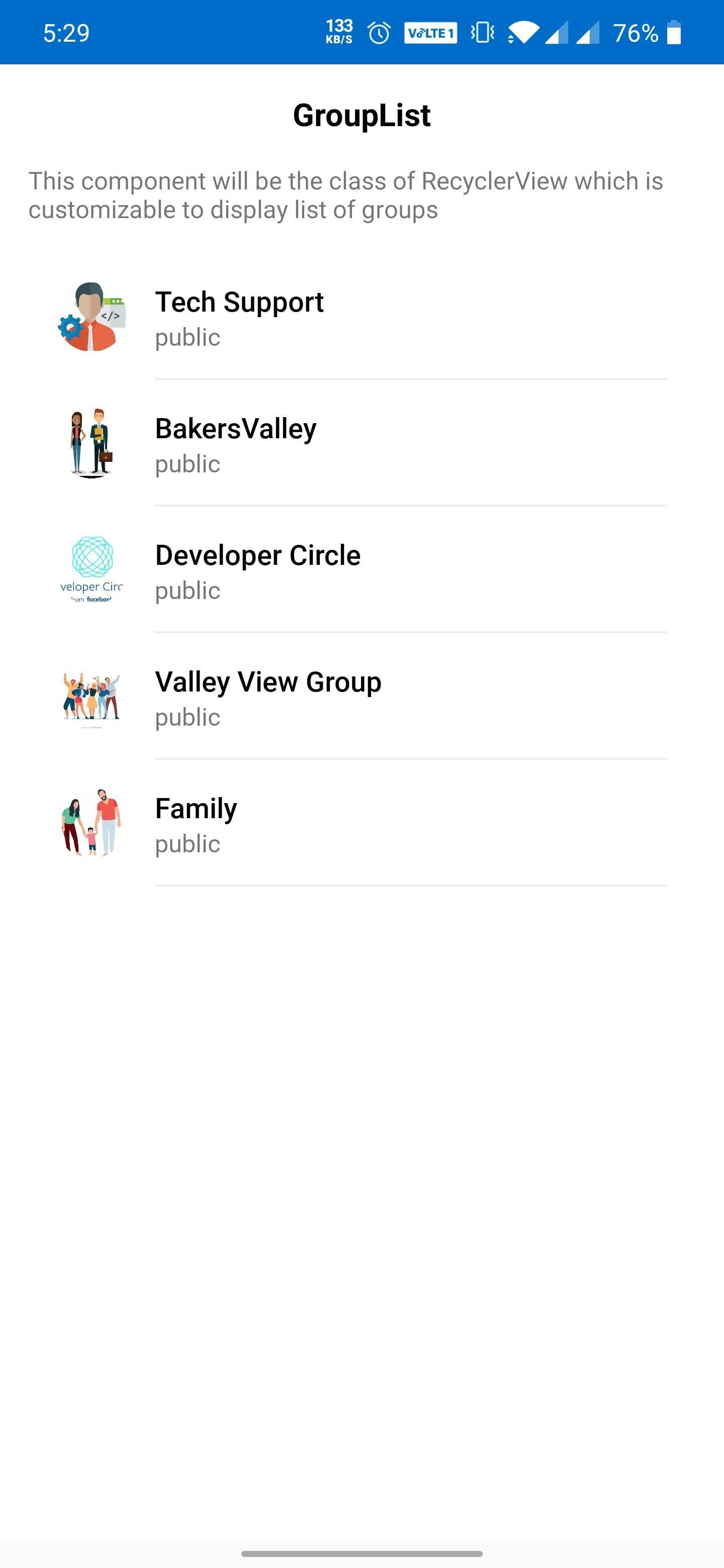TheCometChatGroups is a custom RecyclerView that helps you to display a list of groups.